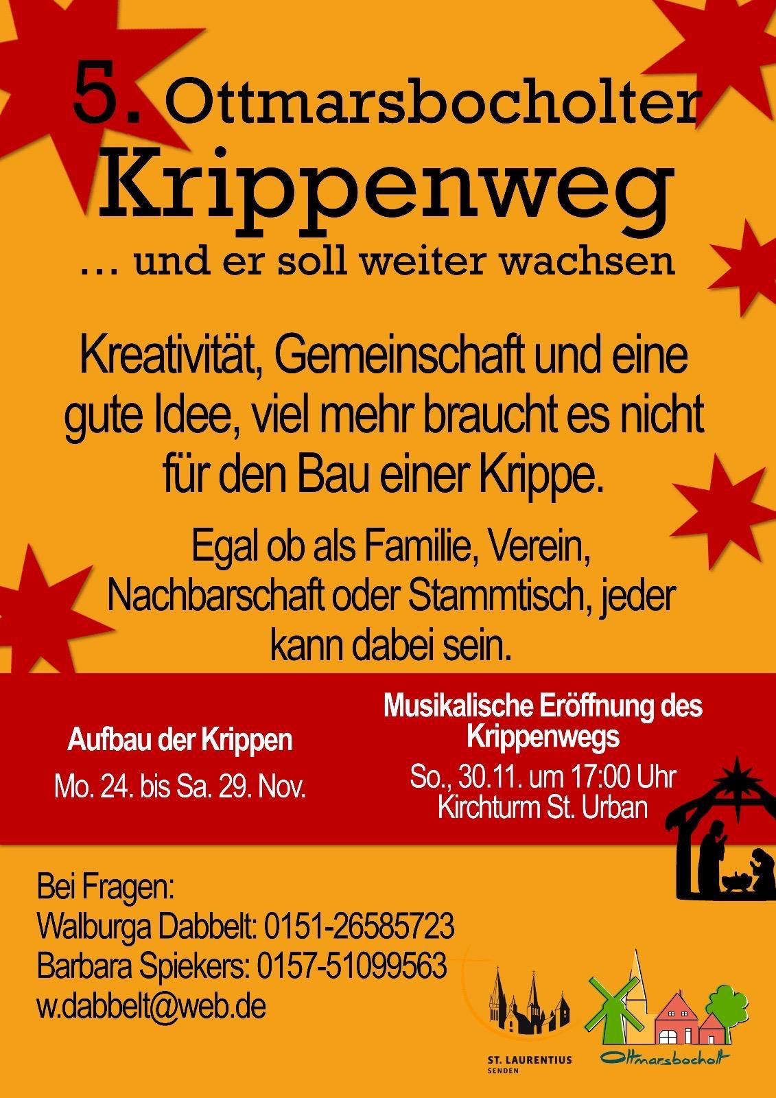 Wir freuen uns, Sie auf der Homepage von Ottmarsbocholt begrüßen zu dürfen. Neben Informationen rund um das Dorfgeschehen finden sich hier Links zu Ottmarsbocholter Vereinen, Einrichtungen, Geschäften und Betrieben. Darüber hinaus wurden in den Portrait-Rubriken Informationen zusammengestellt, die einen Eindruck von Ottmarsbocholt und den hier wohnenden Menschen von früher bis heute vermitteln sollen.